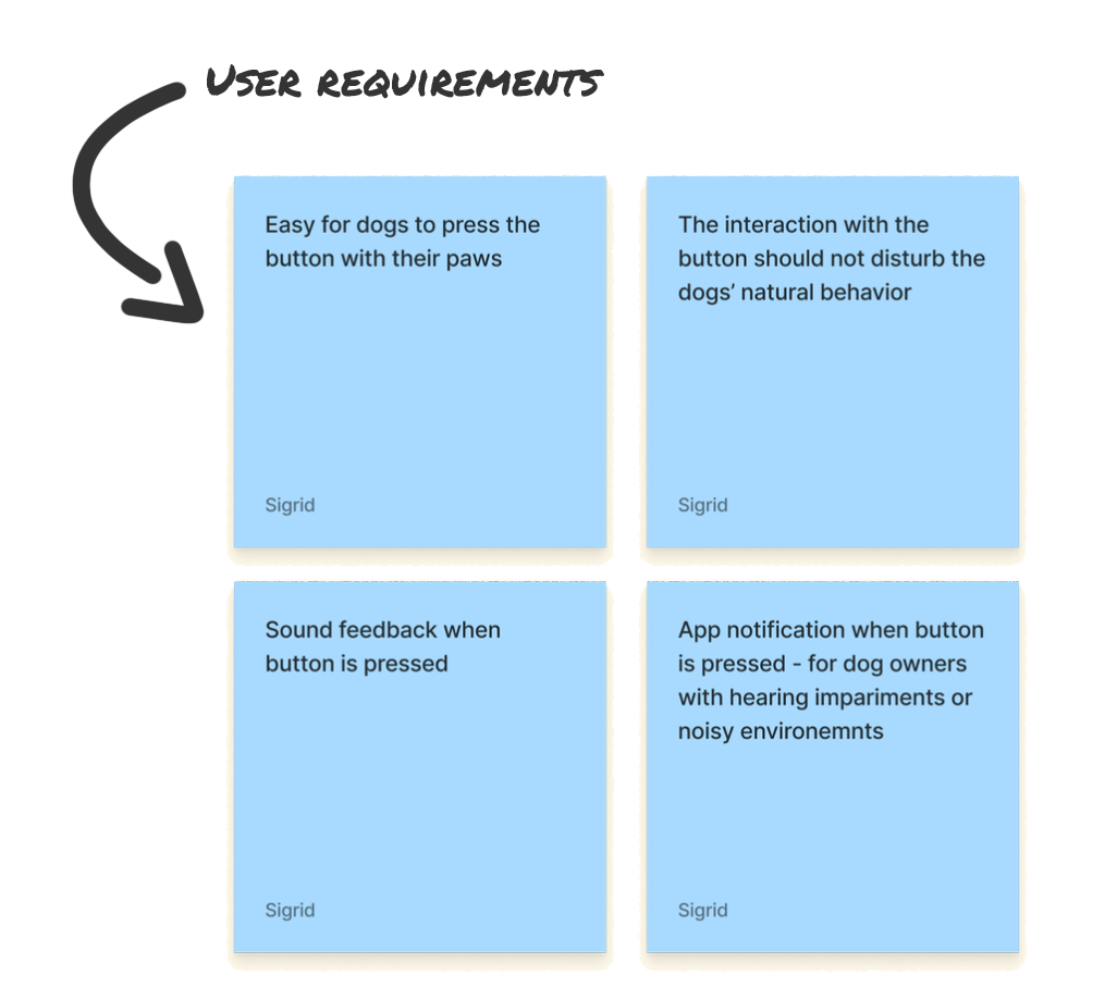 Based on the observations, behavioral analysis, and early concept testing, we defined key user requirements to guide our design decisions. These helped ensure the interaction would be intuitive for the dogs, accessible for the owners, and grounded in real behavior.