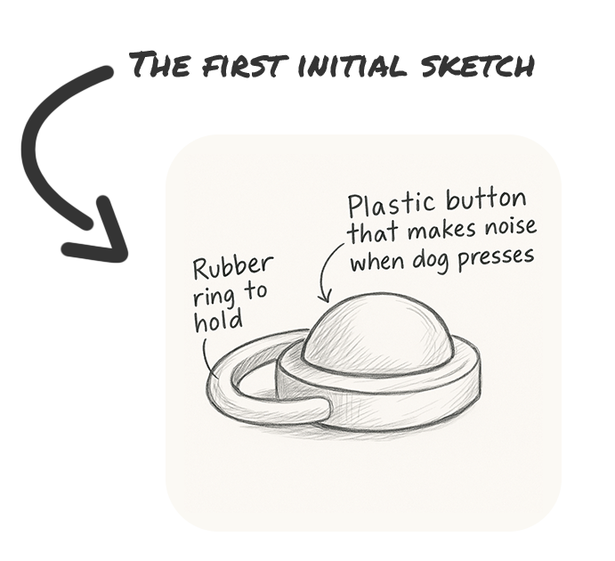 Sketches helped me explore form, size, and material. The first initial sketch of the product was “carryable“, and had a rounded plastic button. After further analysis however, we excluded the “carryable” idea, and focused instead on one clear interaction due to scope and time constraints, and the rounded button was flattened on top to increase usability for pushing.