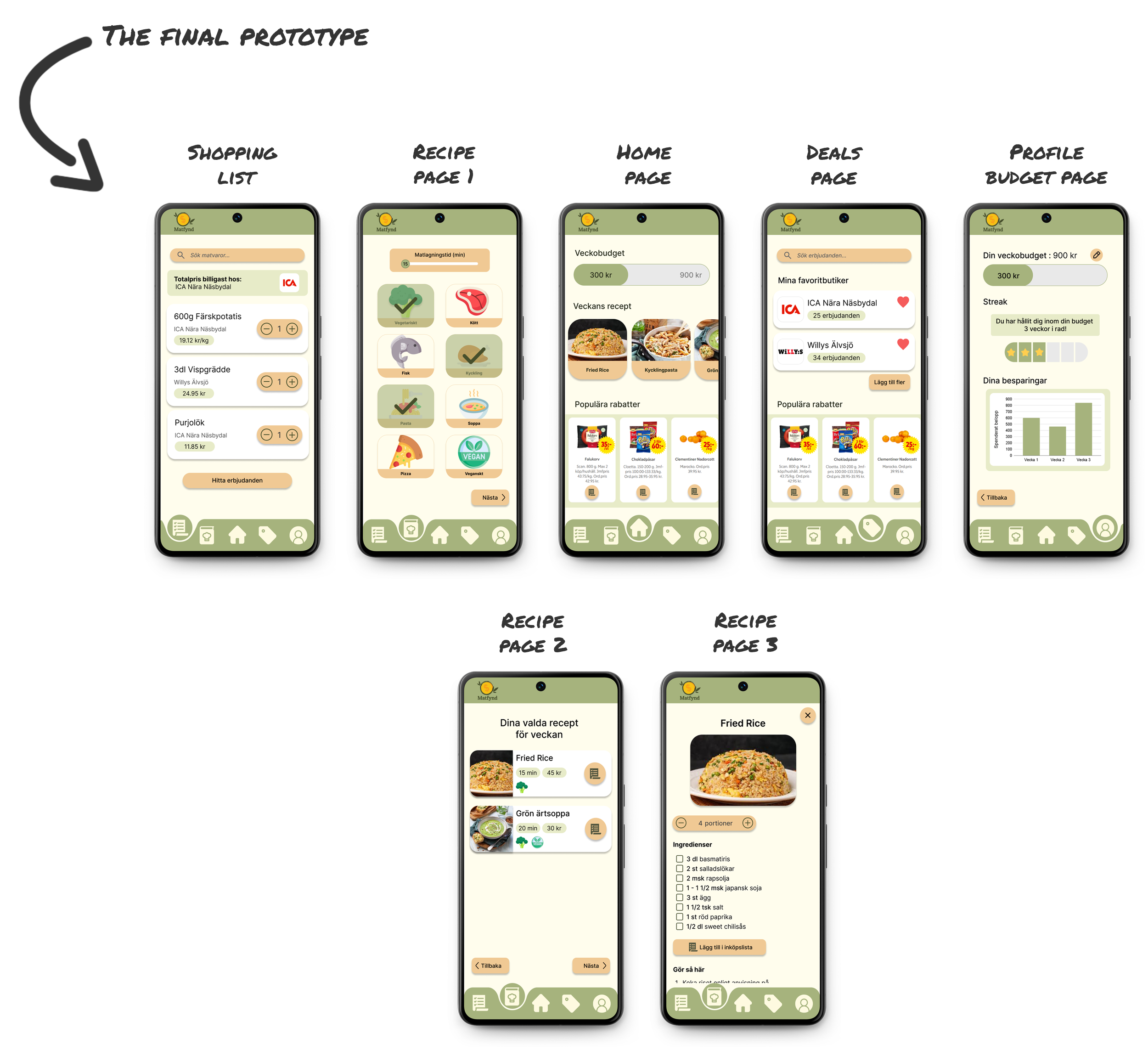 I analyzed apps like Matpriskollen, KitchenPal, and Pantry. While some offered useful features, none successfully integrated budgeting, offers, and recipe planning. For example: