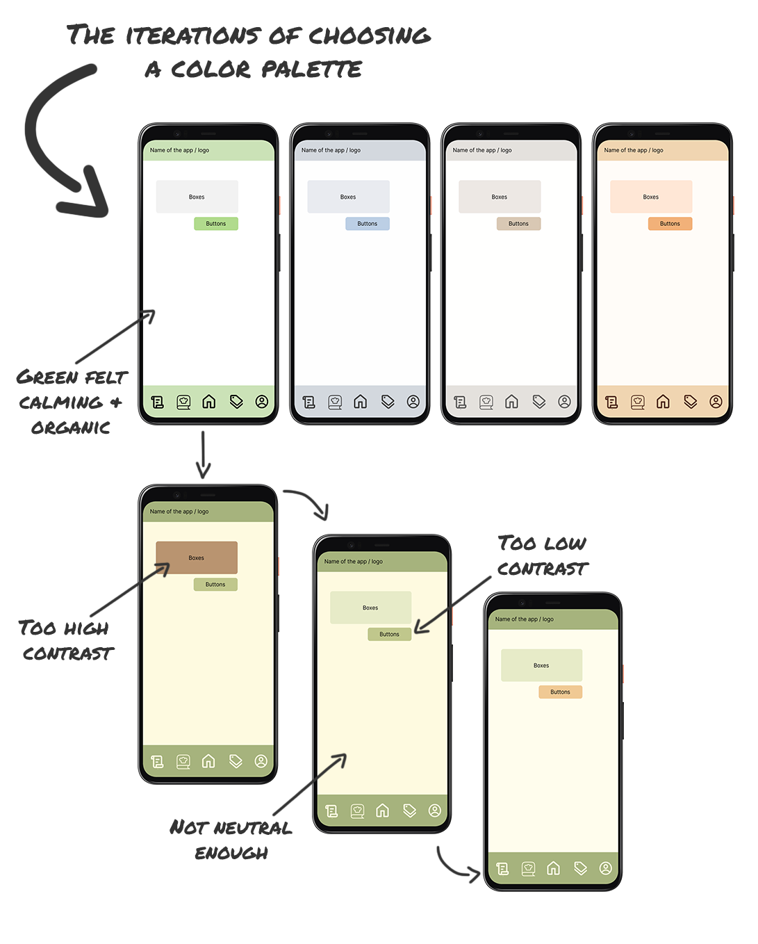 After testing various color palette styles, we chose a nature-inspired color palette to create a calm, friendly feel which aligned with user feedback. Later iterations improved contrast for better accessibility and usability.